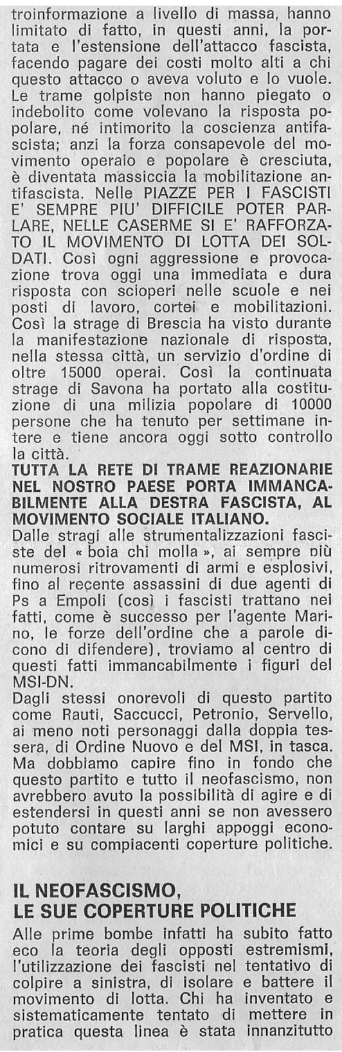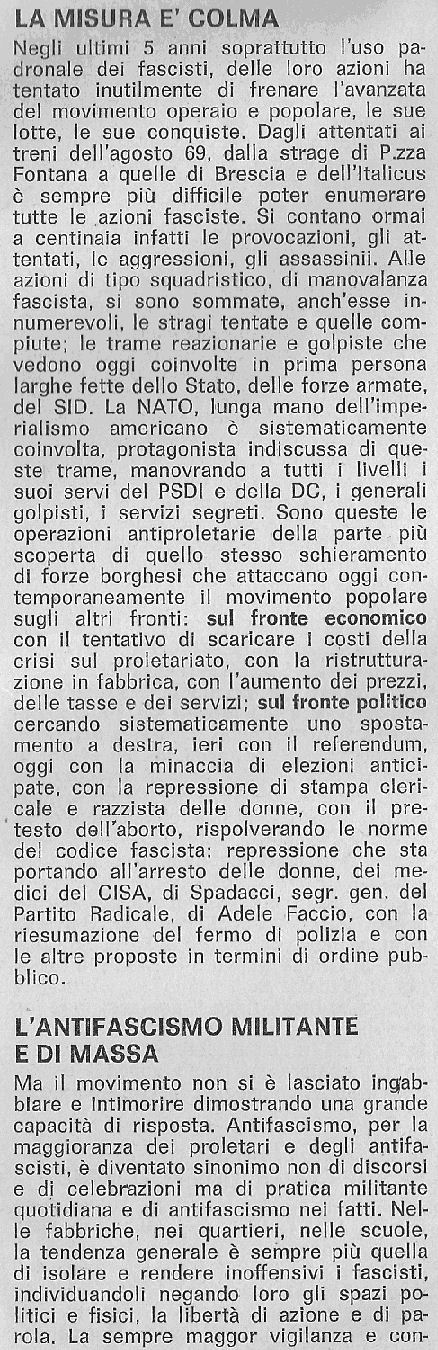 Nel 1974 erano ancora attive le forze che ipotizzavano un golpe di tipo militare, di destra, all'interno delle forze armate e dei servizi segreti.Oggi che il golpe l'hanno fatto, biancastro, sin dal 1983 (Craxi) e dal 1994 (Berlusconi) con l'avallo della sinistra nel 1999 (D'Alema), apparirebbe ridicolo riproporre questa questione, se non fosse che invece per noi quei valori (la Resistenza antifascista, il riconoscimento del lavoro come base della societa' e della liberta' ed eguaglianza senza alcuna discriminazione di fronte alla legge, e della divisione dei poteri, e del popolo sovrano) per noi sono offesi nell'esistente come all'epoca, e pur tuttavia sono necessari ed imprescindibili al progresso. In quel 1974, le Brigate Rosse attaccavano le basi del 'fascismo legale' per raccogliere gli elenchi degli iscritti, e fare controinformazione. In quel 1974, il fascismo diretto (non quello moderno di oggi) era un nemico enorme per tutto il popolo, ma il Pci con la sua direzione antipartigiana, e le organizzazioni della sinistra storica, che odiavano di piu' i compagni a sinistra che i fascisti, convogliavano i propri iscritti e simpatizzanti alla teoria falsa degli 'opposti estremismi', con la quale giustificavano la propria delega, risibile, alle sole forze dell'ordine, a chi fermasse queste forme di stragismo e di attacco che venivano portate avanti da merde fasciste, spesso di orgine alto-borghese, come figli di magistrati, di industriali, che 'combattevano' contro la classe operaia ed il movimento degli studenti, appoggiati dai servizi e dalle strutture americane in Italia.