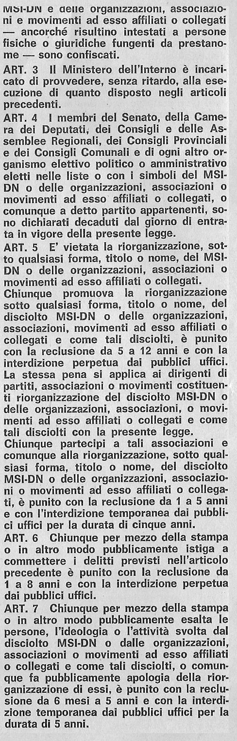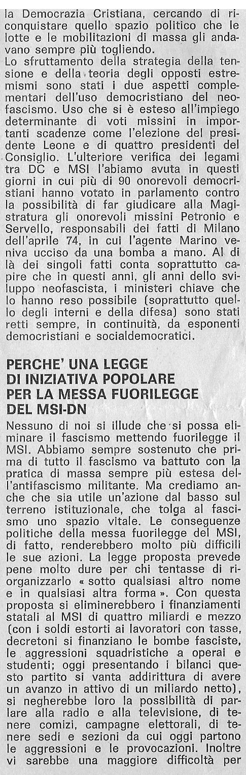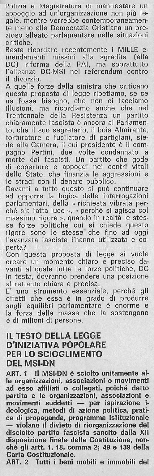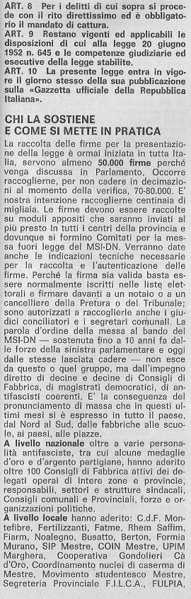 Furono raccolte 100.000 firme, poche per l'epoca, ma anche perche' di fatto gli eventi di quel 1974 e 1975 successivo spinsero molto piu' all'attenzione verso i gruppi della 'destra eversiva' allora definita terrorismo fascista come per distinguerlo dal fascismo parlamentare (Msi-Dn).