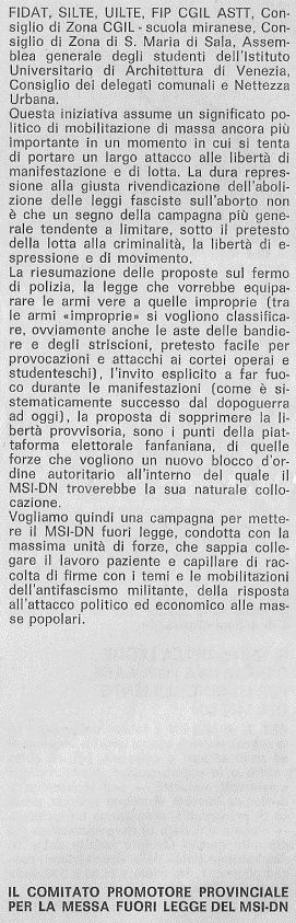 Il testo della campagna diffuso nel veneziano attesta la adesione alla campagna comunque anche di numerose realta' operaie (a livello di delegati, Consigli di fabbrica).